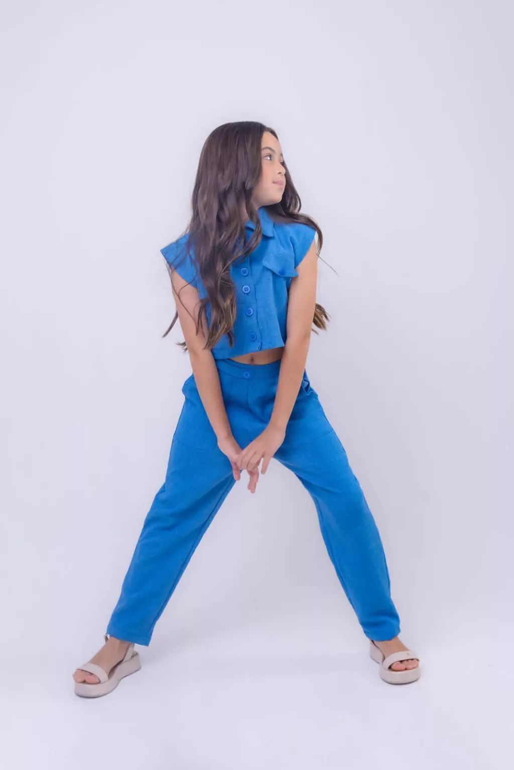 O Conjunto Navy confeccionado em linho rústico (não amassa, toque suave, não encolhe) é simplesmente perfeito. As meninas estão amando esse look moderno, descontraído e cheio de beleza. E o melhor, também super confortável e de excelente qualidade, o que as mamães também adoram.