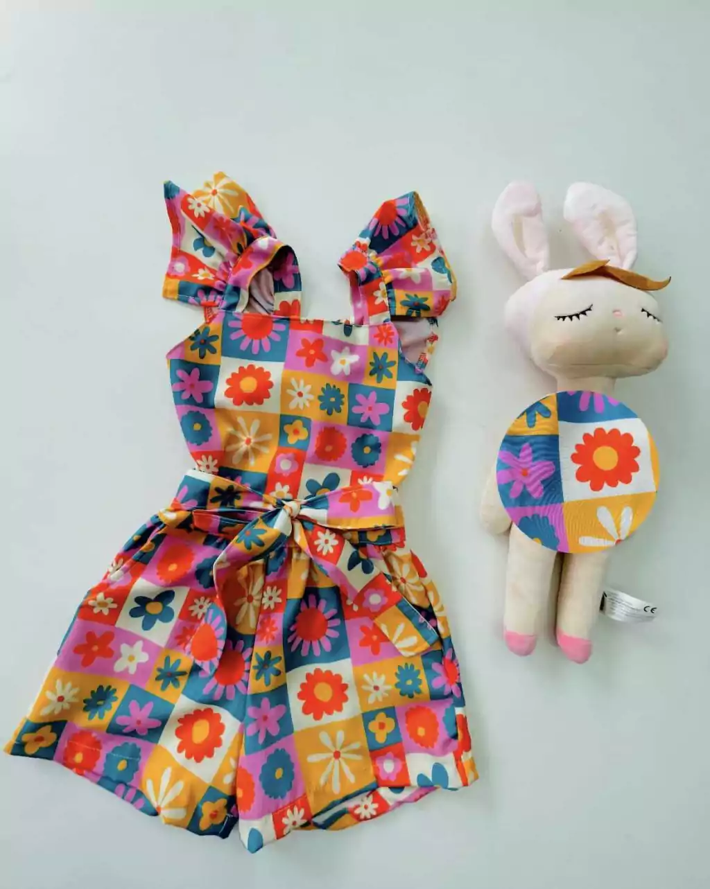 O que a criançada mais ama é um look colorido, confortável e cheio beleza. O macaquinho Aurora tem tudo isso. Estampa lúdica e colorida, babadinhos nos ombros, amarração nas costas com laço e uma faixa para amarrar na cintura. A parte posterior da cintura possui elástico.