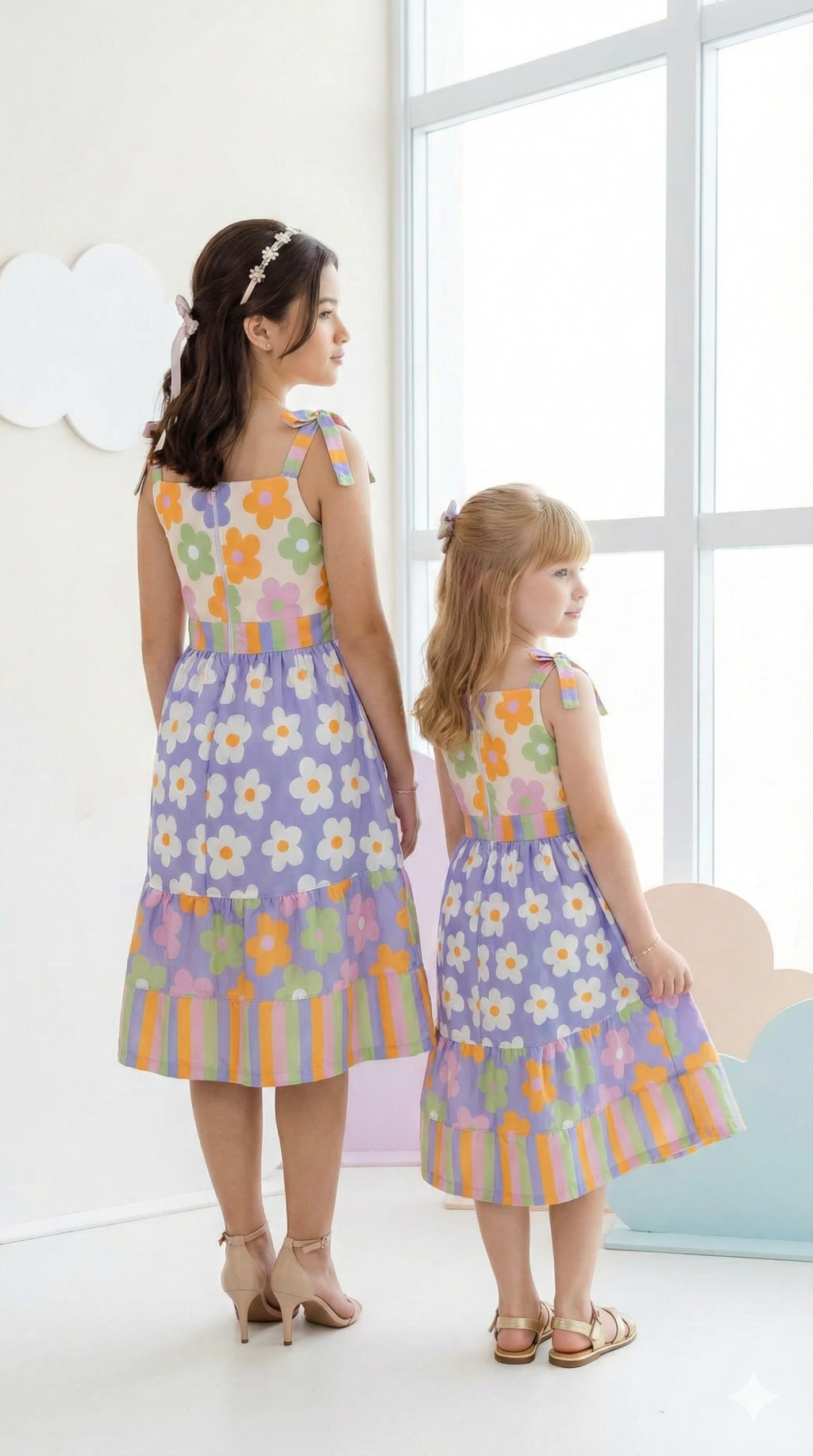 Vestido mid (abaixo do joelho) com amarração ajustáveis nas alças, fechamento com zíper nas costas, e babado na barra e laço na cintura. Estampa com cores lúdicas e suaves.